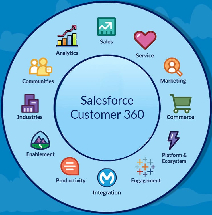 Salesforce Customer 360 is a cross-cloud solution that works as a single source of truth for several data sources. It allows companies to connect Salesforce apps to build a single view of the customer. It incorporates the functionality of MuleSoft to allow companies to connect any app, data source or device across any cloud or on premises server.